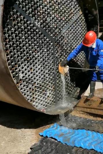 首先將熱交換器的封頭、封尾拆掉,露出所有的列管,然后用剛性噴槍或撓性高壓噴槍插入管孔200-300mm的距離,打開噴槍控制閥,使高壓水加壓,一直到達(dá)額定壓力,隨后,在清洗過(guò)程中,逐步使噴槍向管道深部推進(jìn),直到高壓水射流從熱交換器另外一端噴出。之后,操作人員將噴槍在工作狀態(tài)下緩慢抽回,垢物則繼續(xù)被破碎,直到將噴槍拉回到送進(jìn)時(shí)的管口處,這時(shí)垢物也陸續(xù)被排出管道。此后,采用同樣的方法,對(duì)逐根列管進(jìn)行清洗,直至將整臺(tái)換熱器的管程清洗干凈。